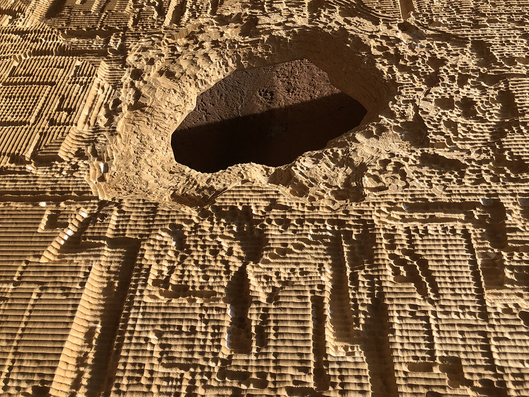 El trabajo propone reflexionar sobre la construcción de la ciudad y el concepto de plaza, renunciando a sus aspectos monumentales y representativos, y definiéndola a través del uso de la voz para designar espacios de escucha mutua. Así, a partir de ejercicios de medición sonora y mapeo con trabajadores y transeúntes habituales de la Macroplaza de Monterrey, se definieron áreas dentro de la plaza en las que (como sucede en comunidades alejadas de los centros urbanos, pero también, como sugieren algunos tratados de urbanismo que aluden al concepto de ciudad ideal), es posible establecer comunicación oral de borde a borde. La escultura colocada frente al Teatro de la Ciudad hace un guiño a las maquetas que normalmente se colocan en los sitios turísticos, pero invierte la representación realista y explota la reducción del espacio de la Macroplaza para visualizar las zonas de escucha, señaladas como cráteres o foros que permiten la interacción corporal del visitante con la obra.